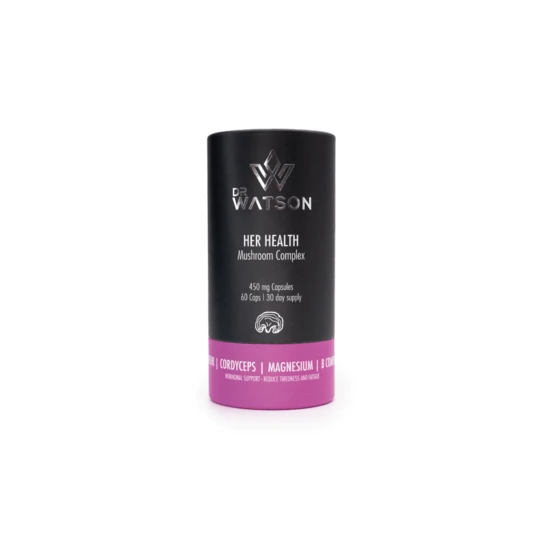 Doctor Watson Her Health mushroom and vitamin complex is an advanced supplement. Containing natural Himalayan mushroom extracts cordyceps, reishi plus vitamin B6, B12, magnesium, vitamin A, and D3.