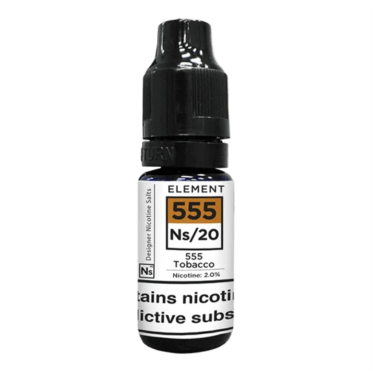 555 Tobacco nic salt e-liquid by Element NS20 Salts is a tobacco based nic salt e-juice with notes of almond, caramel, hazelnut, walnut and vanilla, neatly packaged in a childproofed 10ml bottle.