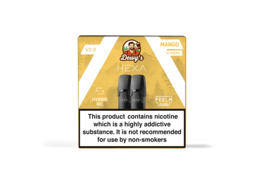 The Hexa 2.0 Dewy’s Mango flavoured filled pod features 2ml of 20mg strength Nic Salt based E-Liquid. These 2ml Hexa Pods e-liquids come in packs of 2 x 2ml disposable pods that are compatible with Hexa 2.0 Pod Starter Kit only.