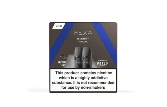 The Hexa 2.0 Blueberry flavoured filled pod features 2ml of 20mg strength Nic Salt based E-Liquid. These 2ml Hexa Pods e-liquids come in packs of 2 x 2ml disposable pods that are compatible with Hexa 2.0 Pod Starter Kit only.
