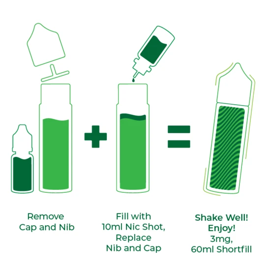 - Ensure you are adding your chosen nic shot to a 0mg, non nicotine based e-liquid. Ensure to check the guidelines below to determine how many nic shots you will need to add to reach your desired strength.