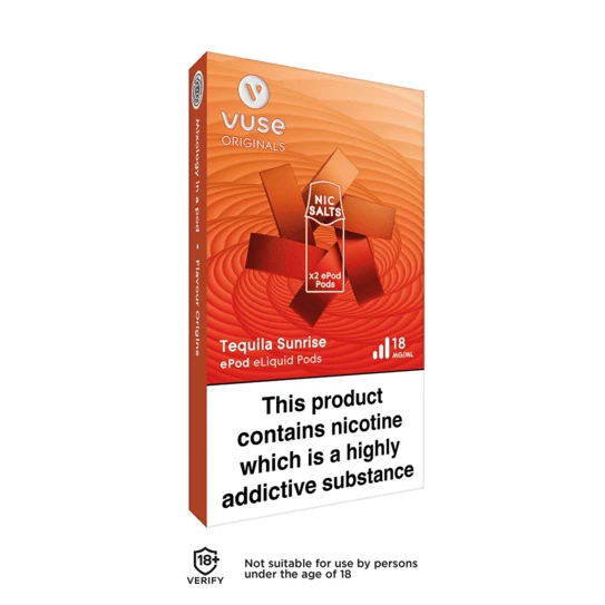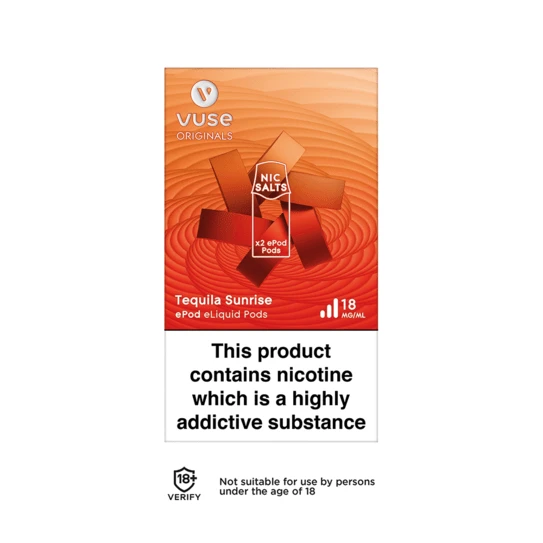Tequila Sunrise ePod cartridges deliver a smooth fruit blend base with notes of golden tequila.